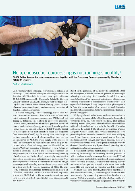 Under the title “Help, endoscope reprocessing is not running smoothly!”, the German Society of Endoscopy Nurses and Associates (DEGEA) held its seminar once again online on 28 July 2021, sponsored by Chemische Fabrik Dr. Weigert. Ulrike Beilenhoff, DEGEA chairman, opened the topic, stating that the seminar would aim to identify typical sources of errors, present contingency and emergency concepts and develop solution approaches.