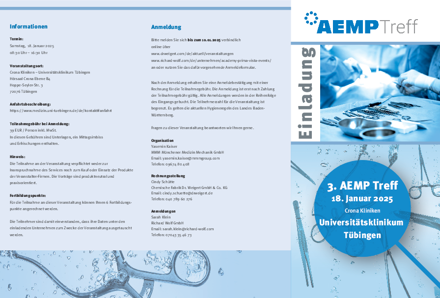 Mit dem 3. Münchener AEMP Forum möchten wir Sie herzlich zu einer Weiterbildung rund um aktuelle Themen zur Aufbereitung von Medizinprodukten…