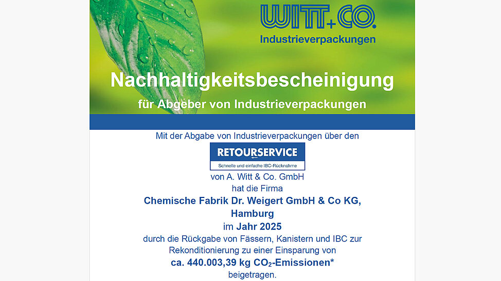 Durch die Rückgabe und Rekonditionierung von Industrieverpackungen über die A. Witt & Co. GmbH konnten insgesamt ca. 440.003 kg CO₂-Emissionen eingespart werden. Diese Zahl steht nicht nur für klimafreundliche Entscheidungen, sondern vor allem für ein aktives Engagement für die Kreislaufwirtschaft und Ressourcenschonung.
